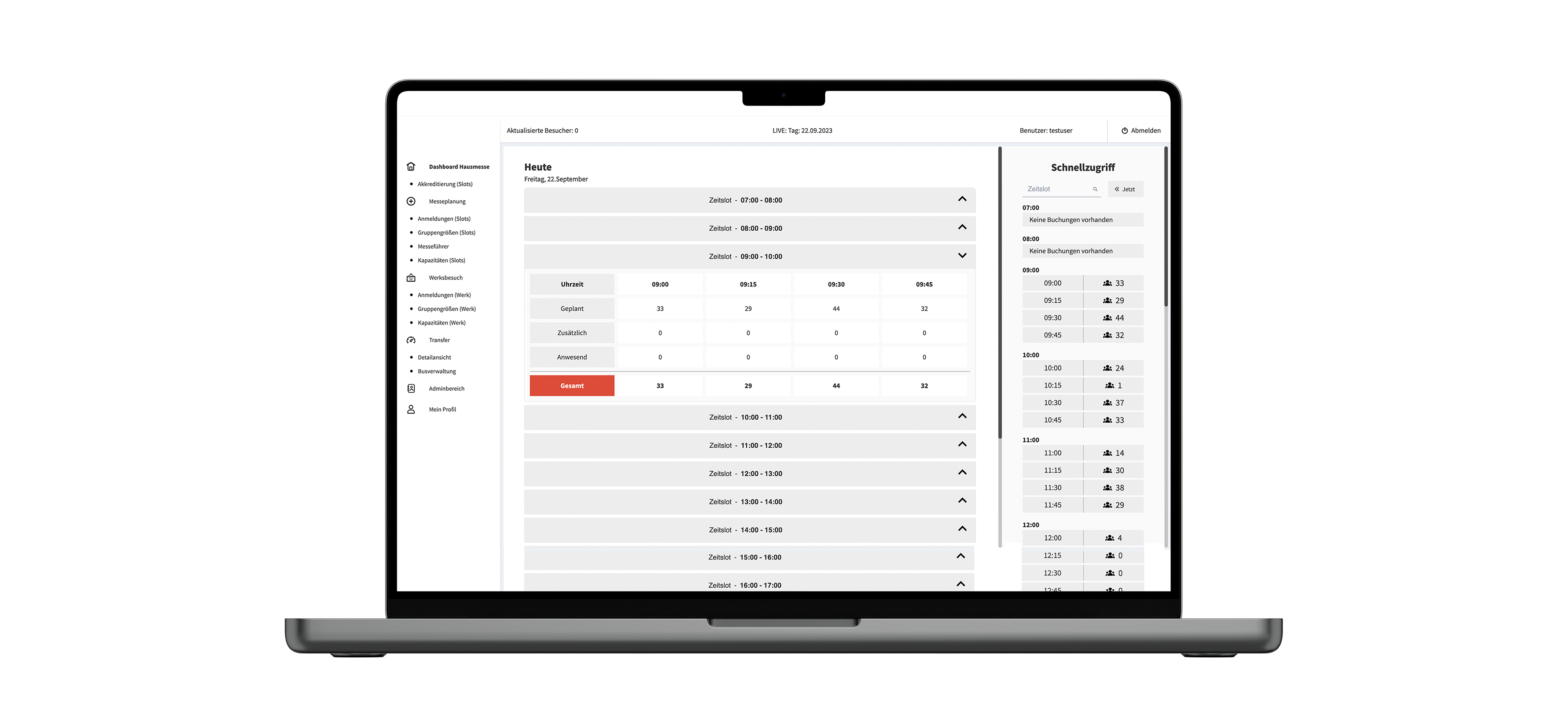 For a mutual customer, we developed a planning tool in cooperation with Löhr & Partner, which can be used to organize and manage the trade fair visitors of a large industrial trade fair. For example, bottlenecks in planning can be visually displayed with the help of various heat maps, visitor data can be managed, and aggregations and other insights can be generated. Our task consisted of the creation of the design as well as the technical implementation. We decided to use a tech stack consisting of MongoDB (database), Node.js (backend) and Angular.